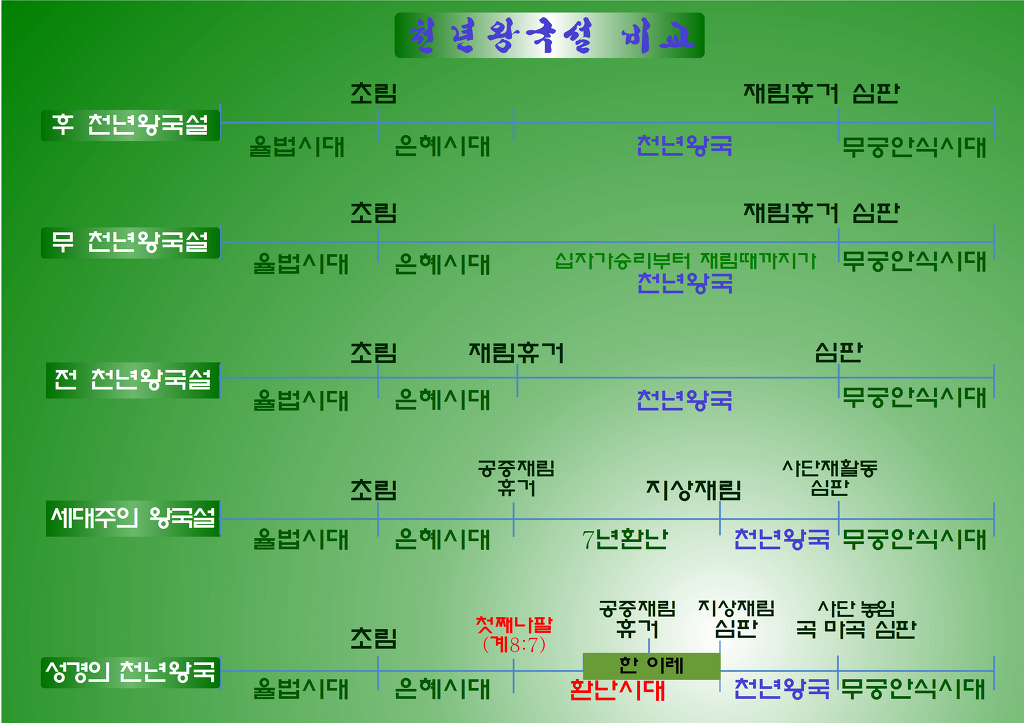 전천년설은 재림전에 천년왕국이 있다는 뜻으로 전천년설이라고 합니다. 전천년설에도 세대주의적 전천년설이 있고 역사적전천년설이 있습니다. 두 설은 비슷하지만 환란설에 관한 견해 차이가 있습니다. 즉 환란 전에 재림과 함께 휴거가 있느냐 환란 후에 재림과 함께 휴거가 있느냐 하는 견해 차이 때문에 서로 달라지는 신학적인 견해입니다. 도표를 잘 보시면서 대략적인 이해만 하시면 될 것 같습니다.