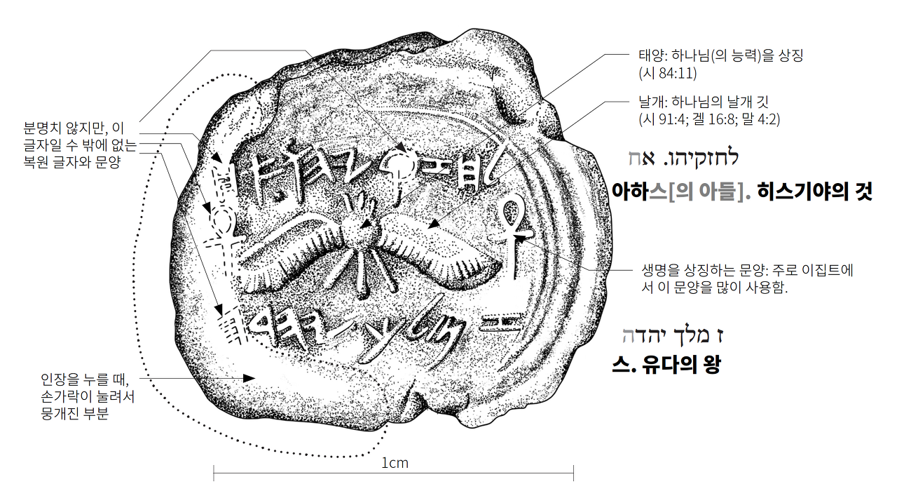 히스기야 시대에는 두개의 왕궁이 있었습니다. 하나는 다윗의 시대에 다윗이 살던 궁이 있었구요. 또 다른 하나는 솔로몬이 오벨산에 만든 자기의 궁전입니다. 솔로몬의 궁은 그 이후로 유다의 왕들의 궁전이 되었지요. 유다 왕들의 궁전이라고 추정되는 오벨산의 곳곳은 이미 고고학자들이 참 많은 발굴들을 했습니다. 그 중에서 2015년에 에일랏 마잘 (Eilat Mazar)은 발굴은 정말 놀랍습니다. 마잘이 발굴한 오벨산의 한 지역에서 대략 30개의 인장의 봉인들이 발견되었는데요. 이 가운데 하나가 히스기야 왕의 인장이었습니다. 히스기야의 이 인장 모양은 앗수르의 침공을 받았을 때, 하나님의 도우심으로 적들을 물리친 후에 히스기야가 병이 들었는데, 병이 낫고 난 이후에 만들어진 인장으로 추정됩니다. 성경을 보면, 병든 히스기야에게 이사야가 찾아오지요. 그리고서는 삼일 만에 낫게 하신다는 하나님의 말씀을 전합니다. 그리고 그 징표로 하늘의 해 그림자를 십도 뒤로 물러가게 하셨습니다(왕하 20). 히스기야의 인장을 보면, 태양이신 하나님(시 84:11)을 방패 모양으로 상징적으로 표현해 놓고, 하나님의 깃(시 91:4; 겔 16:8; 말 4:2)을 표현해 놓았습니다. 그래서 이 인장이 히스기야가 이사야의 예언과 그 예언 후에 낫게 되었을 때, 낫게하신 하나님을 기억하면서 새겼던 것이 아닌가 추정하는 겁니다.