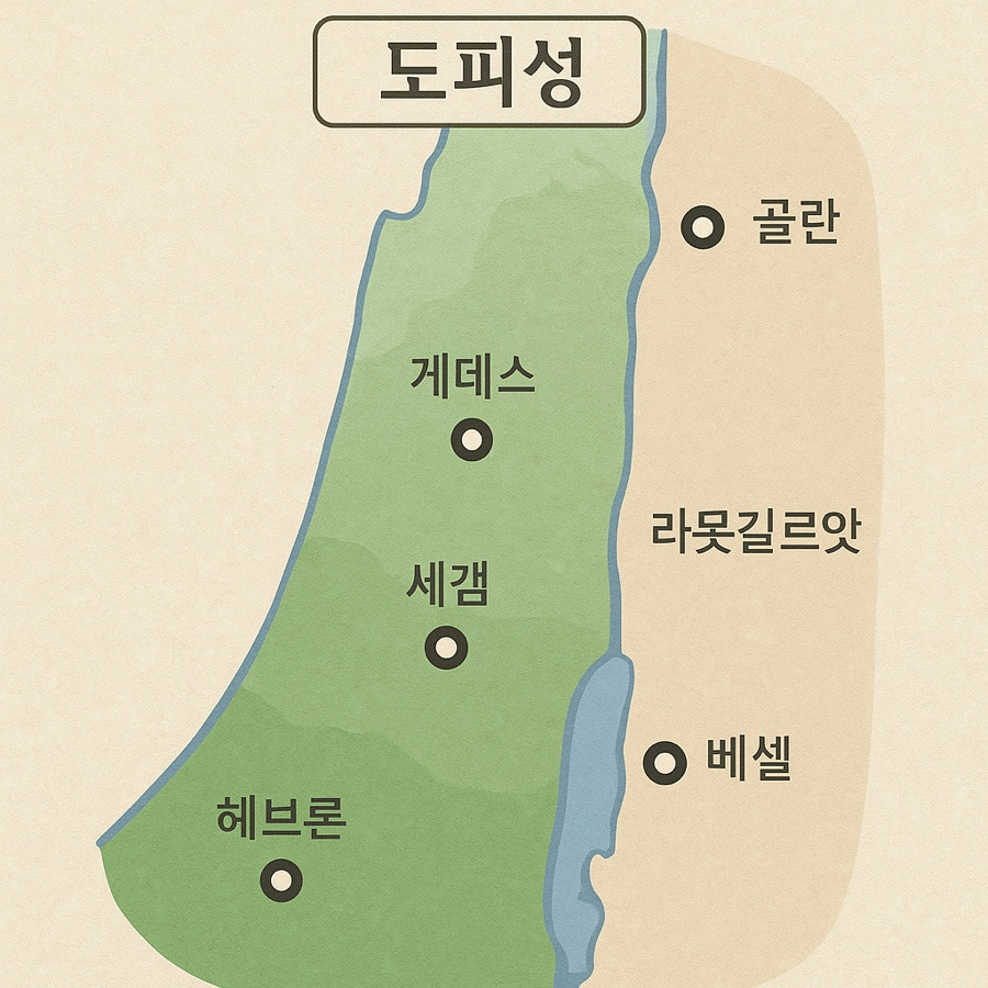 이곳은 이스라엘의 주 정착지이며, 도피성이 각 지역 중심에 고루 분포되었습니다.