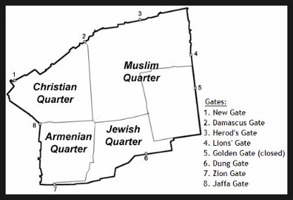 오늘날 예루살렘 구도시는 크게 네 구역, 즉 기독교인 구역(Christian Quarter), 무슬림 구역(Muslim Quarter), 유대인 구역(Jewish Quarter), 아르메니아인 구역(Armenian Quarter)으로 나누어져 있다. 여기에는 모두 8개의 문들이 있다.